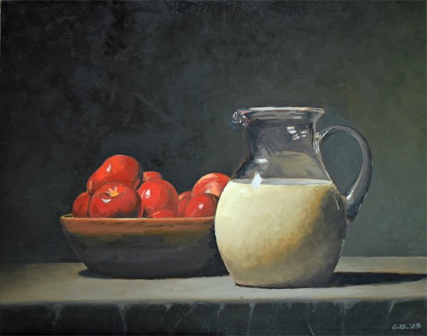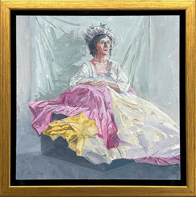 After working in acrylic for many years, I recently switched (back) to oil paints. Although oil takes a long time to dry, making overpainting difficult at times, there are other advantages. Oil is much more fluid than acrylic and is free of acrylic's biggest headache, that of drying one or two shades darker than when wet. Blending in oil is also much better. One strategy I adopted on two recent paintings, 'Japanese Breakfast' and 'Kyoto Street Scene', was to paint part of the painting in acrylic but use oil for the face and figures, where the ability to blend was important. Starting with "Assirat" (2019), all my paintings have been done entirely in oil.