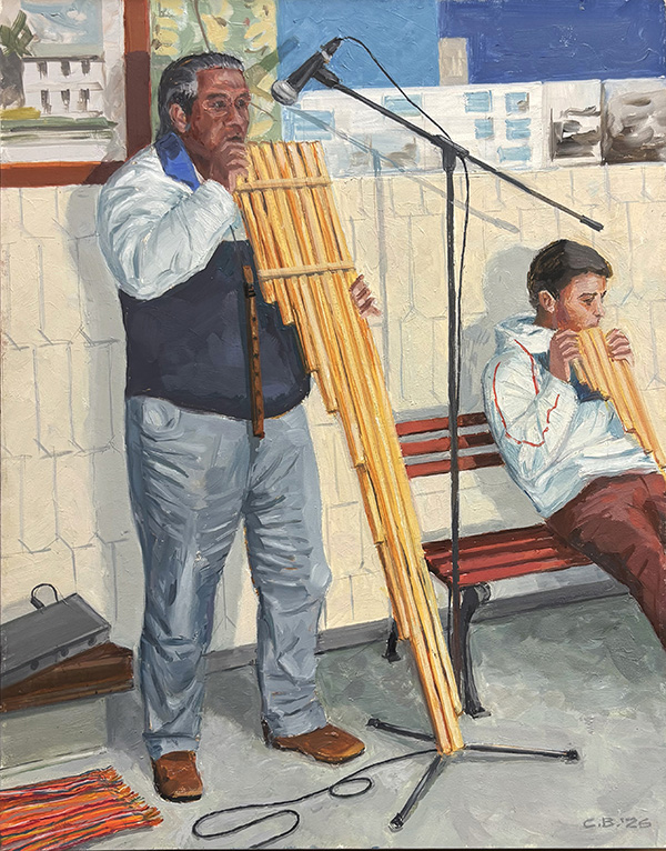 After working in acrylic for many years, I recently switched (back) to oil paints. Although oil takes a long time to dry, making overpainting difficult at times, there are other advantages. Oil is much more fluid than acrylic and is free of acrylic's biggest headache, that of drying one or two shades darker than when wet. Blending in oil is also much better. One strategy I adopted on two recent paintings, 'Japanese Breakfast' and 'Kyoto Street Scene', was to paint part of the painting in acrylic but use oil for the face and figures, where the ability to blend was important. Starting with "Assirat" (2019), all my paintings have been done entirely in oil.